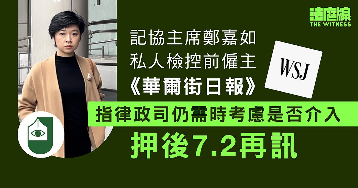 Hong Kong journalist Selina Cheng (鄭嘉如), the chairperson of the Hong Kong Journalists Association (HKJA) who contends that she was illegally dismissed in July last year by the Wall Street Journal after her election to her HKJA position, appeared in Eastern Magistrates’ Court Tuesday through legal representatives in her private prosecution against her former employer. According to the court reporting outlet The Witness (法庭線), Cheng’s case involves two charges claiming her employer demanded she withdraw from the HKJA election and later terminated her employment for holding the position. Barrister Ma Ah-shan (馬亞山) represented Cheng in the proceedings, which were adjourned until July 2 by Principal Magistrate So Man-lung (蘇文隆). Hong Kong’s Department of Justice reportedly has requested additional time to consider intervention in the case — possibly considering its unwanted visibility on the question of deteriorating press freedoms in Hong Kong.