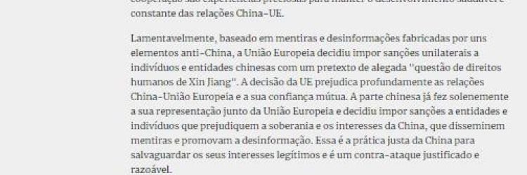 On April 26, 2021, the Chinese Ambassador to Portugal published a signed article in the Portuguese newspaper Diário de Notícias titled “Jointly Safeguard the Healthy Development of China-EU Relations” (共同維護中歐關係健康發展). In the article, the ambassador expressed “regret” over the EU sanctions targeting Chinese officials over human rights abuses in Xinjiang, saying that China only imposed counter-sanctions as a retaliatory measure, labeling the EU actions as interference in China’s internal affairs. The ambassador also discussed Portugal’s role as the EU’s rotating presidency holder in the first half of 2021 and expressed hope that Portugal would promote “objective” views of China among EU member states. The article followed the levying of joint sanctions in March 2021 by the European Union, the US, Canada and the UK against senior Chinese officials over abuses targeting the Uyghur minority in Xinjiang, which prompted Beijing to retaliate by blacklisting numerous EU lawmakers and scholars.
