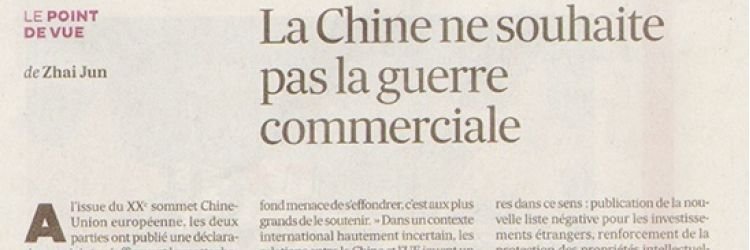 On July 25, 2018, Les Échos published an article by Chinese Ambassador to France Zhai Jun (翟隽) titled “China’s Position on Avoiding a Global Trade War,” following the 20th China-EU Leaders’ Meeting held on July 16, 2018 in Beijing. In the article, Zhai accused the United States of “implementing protectionism under the banner of its own priorities” and characterized US actions as “wielding the tariff bludgeon,” claiming these measures “forced China to retaliate.” The ambassador’s commentary addressed the trade disputes triggered when President Trump signed a memorandum on March 22, 2018, directing tariffs on Chinese goods following a Section 301 investigation into China’s technology transfer and intellectual property practices. The US implemented 34 billion dollars in tariffs on Chinese goods on July 6, 2018, with China retaliating the same day. The ambassador also advocated for closer China-Europe cooperation and called for alignment between China’s Belt and Road Initiative (BRI) and European infrastructure plans to achieve what he called “mutual benefits.”