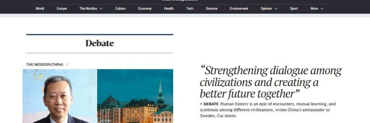 On June 19, 2025, Cui Aimin (崔愛民), China’s ambassador to Sweden, published a signed article titled “Strengthening the Dialogue Among Civilizations, Creating a Better Future Together” in the Swedish media outlet The Nordic Times. In the article, Cui noted recent celebrations for the International Day for the Dialogue Among Civilizations, a UN initiative jointly proposed by China, with eventual support by more than 80 countries. The notion of civilizational exchange is a political concept dating back in its contemporary CCP sense (“Xivilization”) to the 20th National Congress in 2022, when Xi Jinping and the top leadership used it to trumpet the supposed success of the CCP-led development model and argue that China has created “a new form of human civilization” (人類文明新型態). Cui called on China and Sweden to uphold the spirit of civilizational exchange and to move forward together toward the vision of building a “community with a shared future for mankind,” as proposed by Xi Jinping.