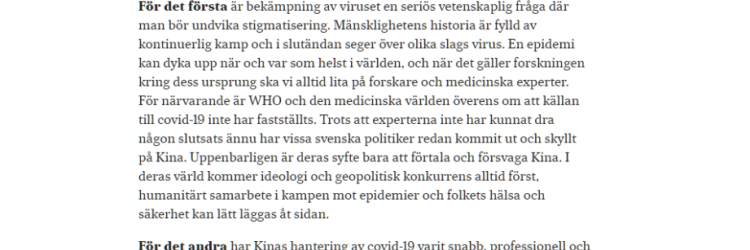 On April 22, 2020, Chinese Ambassador to Sweden Gui Congyou (桂從友) published a signed article in the Stockholm-based daily Svenska Dagbladet responding to an opinion piece by politicians from Sweden’s Moderate Youth League critical of Beijing’s pandemic response. Gui accused them of “smearing and weakening China” (抹黑中國、削弱中國) and of prioritizing ideology over humanitarian cooperation. He also asserted that Chinese citizens enjoy full democratic freedoms and that China is committed to the rule of law and openness — standard Party talking points delivered through the combative style that made Gui one of Beijing’s most prominent wolf warriors.