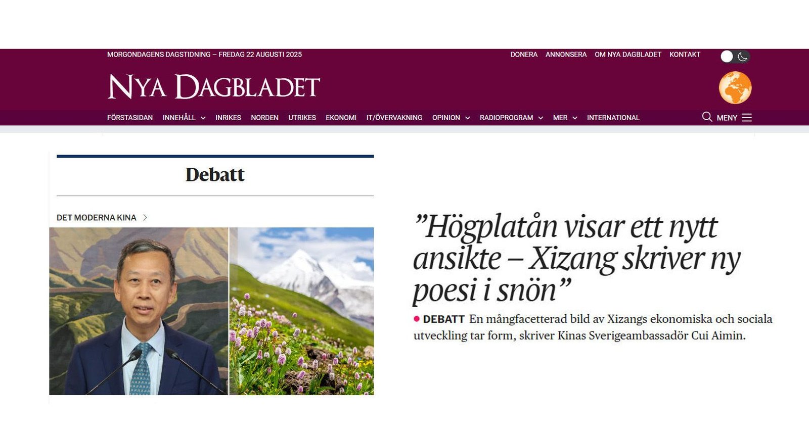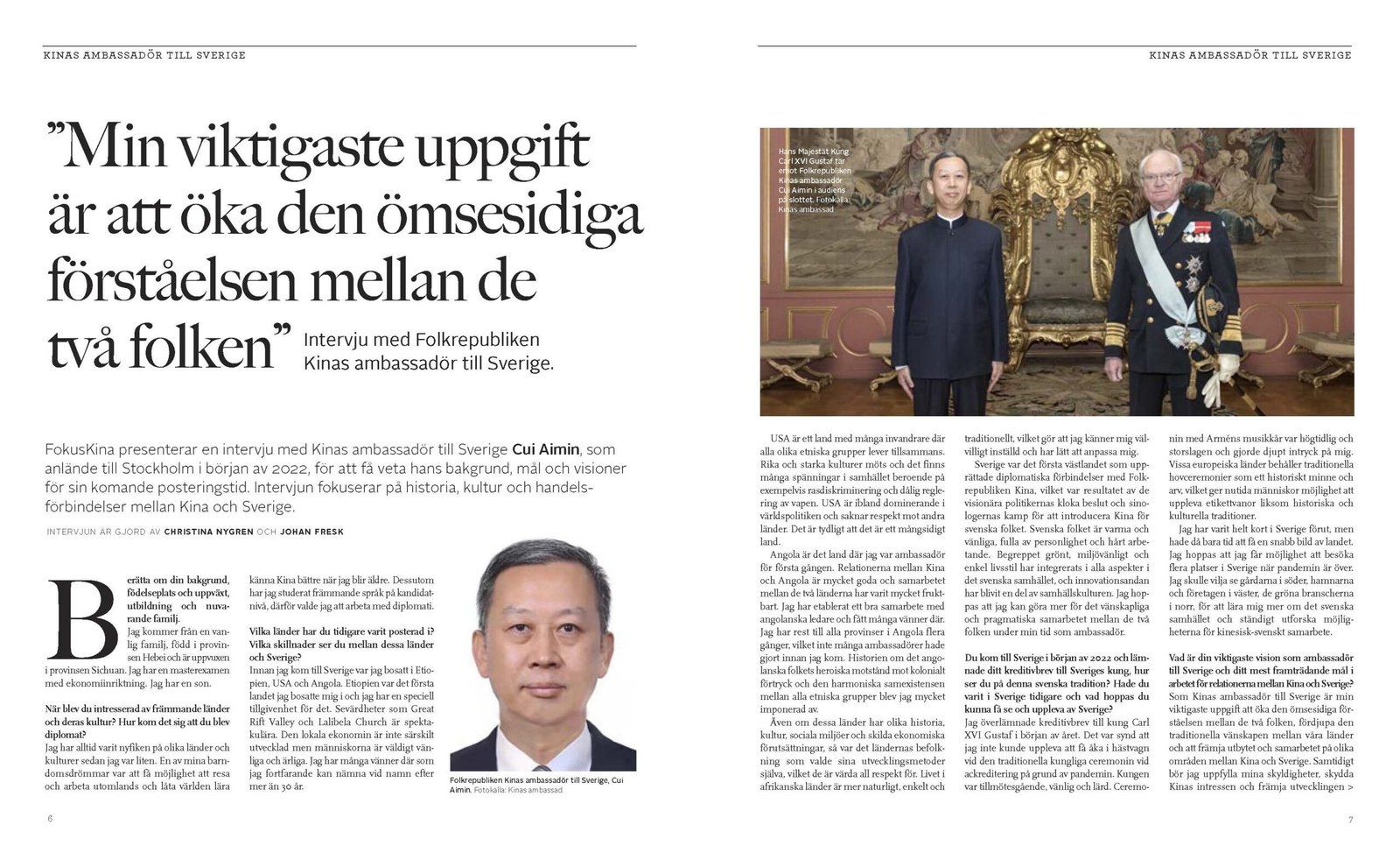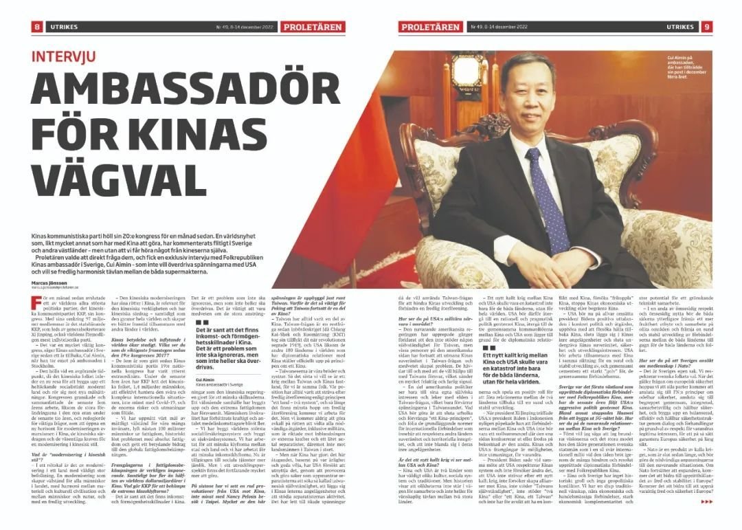 On September 20, 2022, the Chinese Embassy in Sweden published the full text of an interview between Chinese Ambassador to Sweden Cui Aimin (崔愛民) and FokusKina, a Swedish association and magazine with strong China links that is focused on Chinese history, culture, and society. Topics included Cui’s diplomatic career, Sino-Swedish cultural exchange, COVID-19, and bilateral trade. The interview featured standard CCP discourse, including calls for “mutual respect and win-win cooperation” (相互尊重互利共贏). On Taiwan, Cui claimed that the country had “since ancient times” (自古以來) been part of China, that “one China, one Taiwan” or “two Chinas” would not be permitted — misleading discourse that goes against professional readings of international law — and warned that China would take “all necessary measures” (一切必要措施) should “Taiwan independence forces” or external actors provoke a response.