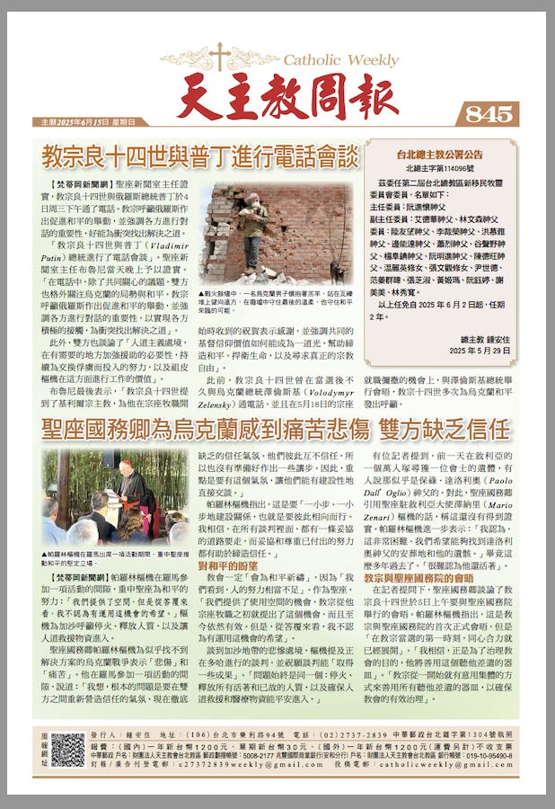 TT: For Taiwan, we have one religious newspaper, the Catholic Weekly (天主教周報). It is issued by the Taipei Archdiocese and covers Catholic Church issues across all of Taiwan every week.